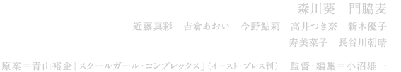 監督=小沼 雄一。【プロフィール】1965生まれ。茨城県出身。法政大学卒業後、映画監督今村昌平氏が創設した日本映画学校に入学。95年、日本映画学校の卒業制作として監督した映画「チャンス・コール」が今村昌平賞を受賞。同年、文芸座にて劇場公開される。卒業後、井出良英、池田敏春、緒方明、行定勲等の監督のもと、助監督として現場経験を重ねたのち、03年にOV「自殺マニュアル2―中級編―」で商業監督デビュー。主な作品に「童貞放浪記」2009、「結び目」2010、「nude」2010などがある。演出コンセプト「スクールガール・コンプレックス」は単に官能をオブラートで包んだ写真集ではなく、アートと欲望の際どい境界を巧妙に捉えた本当の意味でのアートです。視線は対象の顔や目を避けてひたすら身体の細部へと接近する…あるいは日常の空間に顔ではない身体の一部が突然現れる…そうすることによって彼女が心の奥底に仕舞い込んだ欲望を一瞬露わにするような“今”を強く感じずにはいられません。映画にもそのような強烈な“今”が存在します。例えばどこにでもいそうな女子高生が身近にいる同性を好きになってしまった時、彼女は日常の中に不意に訪れた小さな、しかし確かな欲望を瞬間的に垣間見せることがあります。それを通常は、顔の表情や台詞で捉えようとするのが映像の定石ではありますが、そうではない方法があることを「スクールガール・コンプレックス」は教えてくれます。細部に宿る、と。顔ではなく、手で、足で、腰で、髪で、耳で、頬で、指で、ふくらはぎで、彼女は何かを伝えようとします。十代の未熟な姿態は、とても雄弁な言葉を持っているのです。それは主人公が好きな人を見つめるとき、特に発揮されると思われます。主人公は彼女の細部を緻密に見つめ、彼女も主人公の視線を細部に一つ一つしっかりと感じることでしょう。直に触れることのできない彼女とのわずかな距離が、主人公の小さな欲望を震わせる。そんな女子高生達の刹那的な想いを、新しい表現方法で捉えたいと私は考えます。